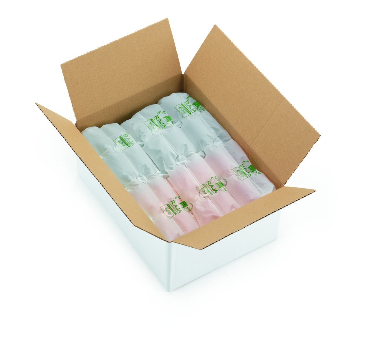 W sklepie RAJA dostępne są gotowe poduszki wypełnione powietrzem. Zawierają aż 99% powietrza i tylko 1% folii, w związku z czym są ekologiczne, ale przy zachowaniu dużej wytrzymałości. Świetnie nadają się do ochrony przesyłanych produktów. Pozwalają zachować czystość i nie wychodzą z opakowania podczas otwierania. Są zapakowane w praktyczne pudełka z dozownikiem, który ułatwia pakowanie. Są wykonane z folii polietylenowej w formie łańcucha poduszek. Poduszki są oddzielone od siebie perforacją, by łatwiej było z nich korzystać.