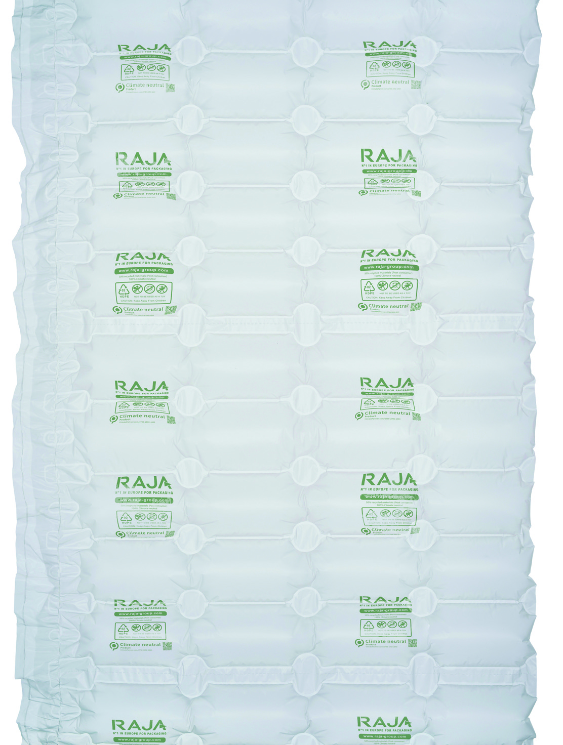 W ofercie RAJA dostępne są trzy rodzaje folii – z folii polietylenowej hdpe, z folii wykonanej w 50% z recyklingu oraz folia wykonana w 35% z naturalnych surowców. Folia z polietylenu hdpe podlega recyklingowi, 1 jej rolka to 4,2 m3 wypełnienia. Folia składająca się w 50% z folii z recyklingu, a w 50% z polietylenu hdpe podlega recyklingowi, a jej ślad węglowy jest w 100% neutralny. 1 rolka pojedynczych poduszek to aż 5,4 m3 wypełnienia. Folia najbardziej ekologiczna to ta składająca się w 35% ze skrobi ziemniaczanej, a w 65% z biodegradowalnego polimeru PBAT – jest zgodna z normą EN 13432. 1 rolka pojedynczych poduszek to 3 m3 wypełnienia.